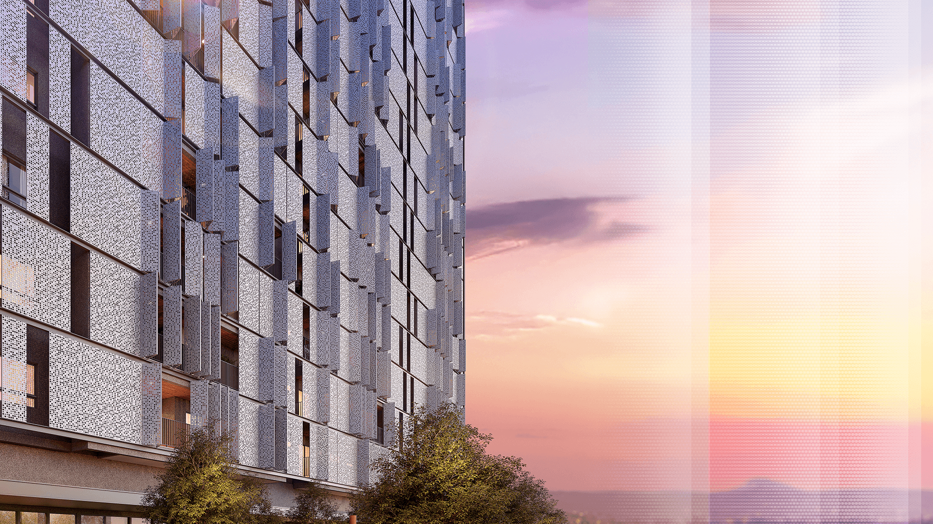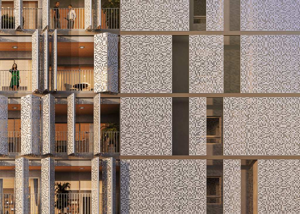 Os brises tipo camarão metálicos perfurados (Hunter Douglas), além de serem um grande elemento na arquitetura moderna, alinhando design inovador e funcionalidade, trazem conforto para os ambientes internos dos apartamentos.