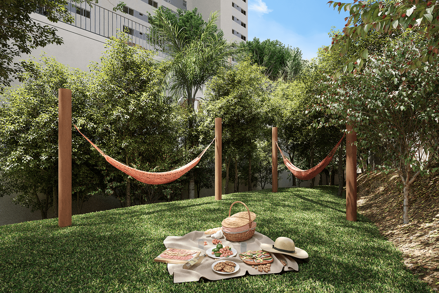 Com 48 espécies nativas, o paisagismo valoriza a brasilidade, resgatando os antigos quintais de família e as memórias afetivas neles inseridas. Árvores frutíferas como jabuticabeiras, araçás e pitangueiras não apenas embelezam o ambiente, mas também promovem um ecossistema vibrante que atrai pássaros e polinizadores, estimulando a convivência ao ar livre e apresentando o novo luxo: viver em meio à natureza.